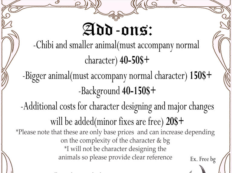 ♦ Animals, but it must accompany the human character (although this depends, I’ll have to see if I’m comfortable with the your chosen animal)
